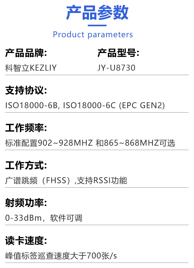 支持协议 | EPC CLASS1 G2、ISO18000-6B | ||