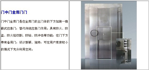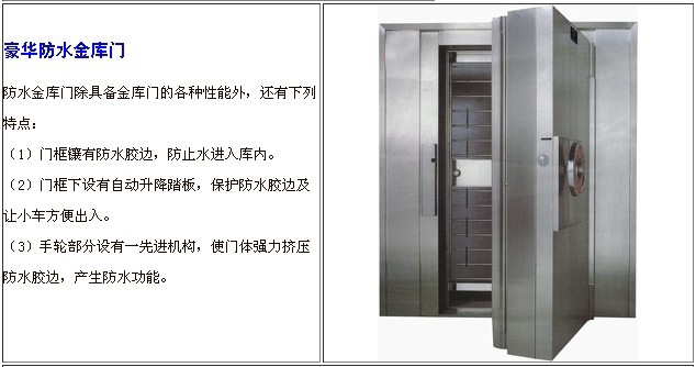 金库门选用优质超厚防爆钢板,特种防钻合金板和标准槽钢、进口不锈钢板、进口密码锁(可按用户需要选配高、中、低档锁具),及特种填充料等利用先进设备加工而成,足以能抵御、阻止目前 先进而强硬的攻击手段;并配置日闸门和备用小门,能确保库内财产的安全。