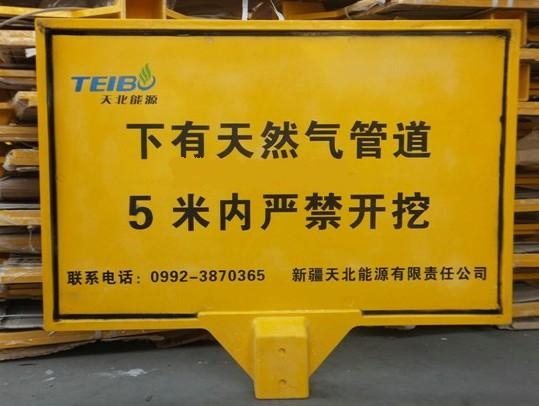 玻璃钢燃气管道标志牌 双柱式玻璃钢标志牌 双柱式玻璃钢标志牌 公路里程分界桩厂家 供水管道标志牌 玻璃钢标志牌 公路里程分界桩电力专用玻璃钢警示牌,中石油燃气管道户外标志牌,挤出玻璃钢工艺。由于受制于工艺要求,挤出玻璃钢表面不平,有气孔,所以对反光膜的粘接力不足。所以也不适宜做交通标志底板。 模压玻璃钢。模压玻璃钢是在高温高压下成型的,表面平,对反光膜的附着力满足要求。按交通部测试反光膜对标志底板附着性能的实验,实验5分钟后,反光膜的剥离长度为3-4mm,大大小于标准要求的20mm。 玻璃钢材料在大气中的老化主要是太阳辐射、高温、潮湿空气及风吹雨打的机械作用,致使玻璃钢表面树脂脱落,露出白丝,失重,同时紫外光照射使活性物质降解、氧化,使玻璃钢颜色黄变。针对以上现象,必须加入防老化剂、抗紫外光剂,延缓其老化过程。标牌是在户外使用,下雨时,不同树脂的耐水性能差别很大,邻型不饱和树脂要好于乙烯不饱和树脂的耐水性。所以选好合适树脂用于标牌上很重要