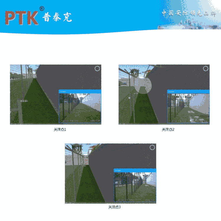 例如:周界四面围墙共有20个防区,在周界三维场景中,每个防区设置一个关注点,并关联附近的摄像机,将20个关注点按顺序设置为一条飞行路线。用户需要巡视周界时,播放该条路线,三维场景按照设置的路线自动飞行,飞到某个关注点时,自动弹出与该关注点关联的摄像机画面。