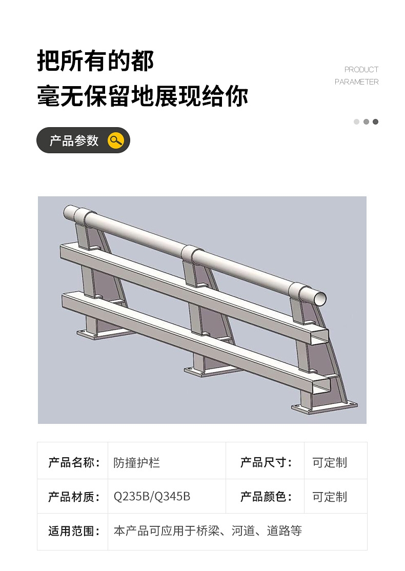 2、栏杆强度应满足:车辆以80KM/H的速度,与栏杆成15°角发生碰撞,不落河。