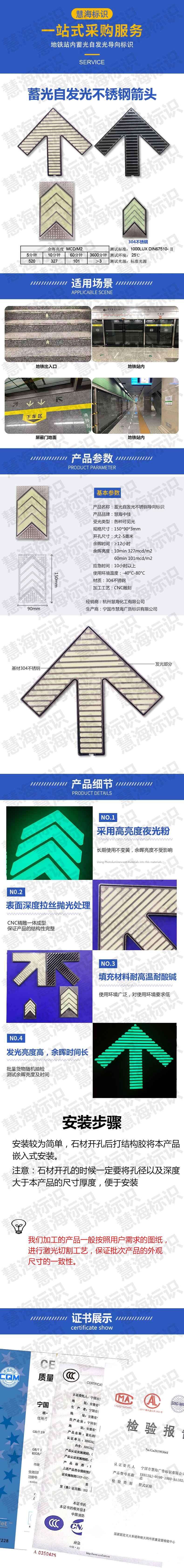 杭州地铁蓄光自发光导向标识,夜光不锈钢箭头