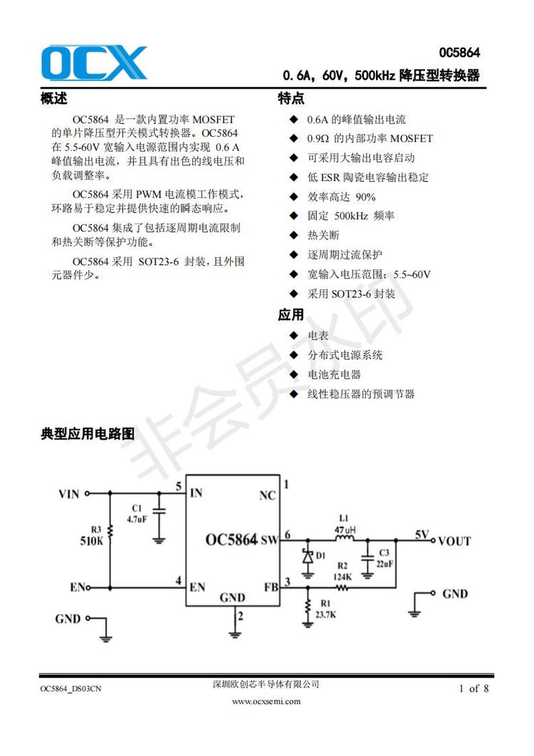 OC5864 是一款内置功率 MOSFET 的单片降压型开关模式转换器。OC5864 在 5.5-60V 宽输入电源范围内实现 0.6 A 峰值输出电流,并且具有出色的线电压和 负载调整率。 OC5864 采用 PWM 电流模工作模式, 环路易于稳定并提供快速的瞬态响应。 OC5864 集成了包括逐周期电流限制 和热关断等保护功能。 OC5864 采用 SOT23-6 封装,且外围 元器件少?。