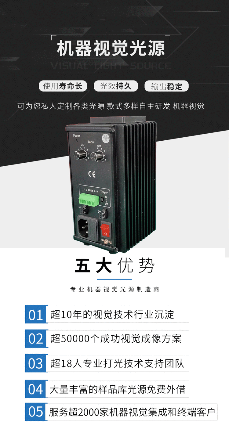SA2系列模拟控制器,外触发采用高速光耦隔离设计。此外,SA2系列控制器提供24V标准电压输出接口,可为机器视觉检测系统中的其它设备(如相机,PLC)提供供电电源。SA2系列控制器具有大功率、多功能、高响应速度、高稳定性等优点。
