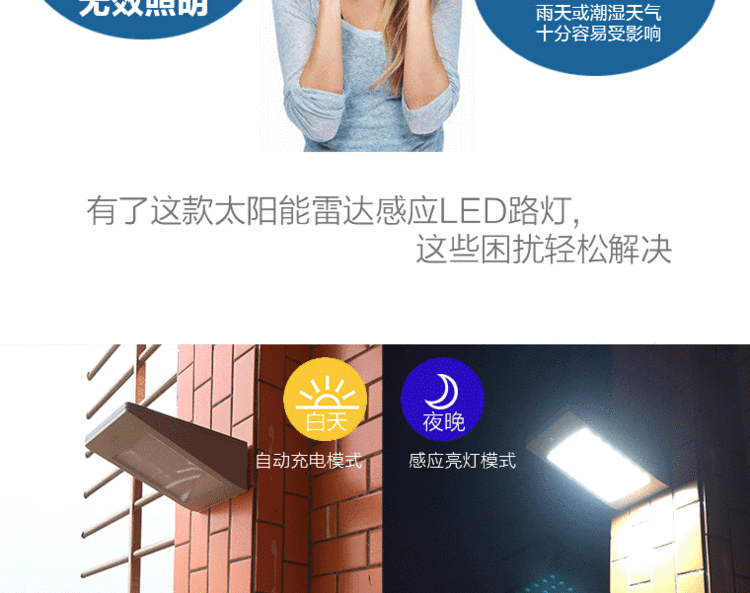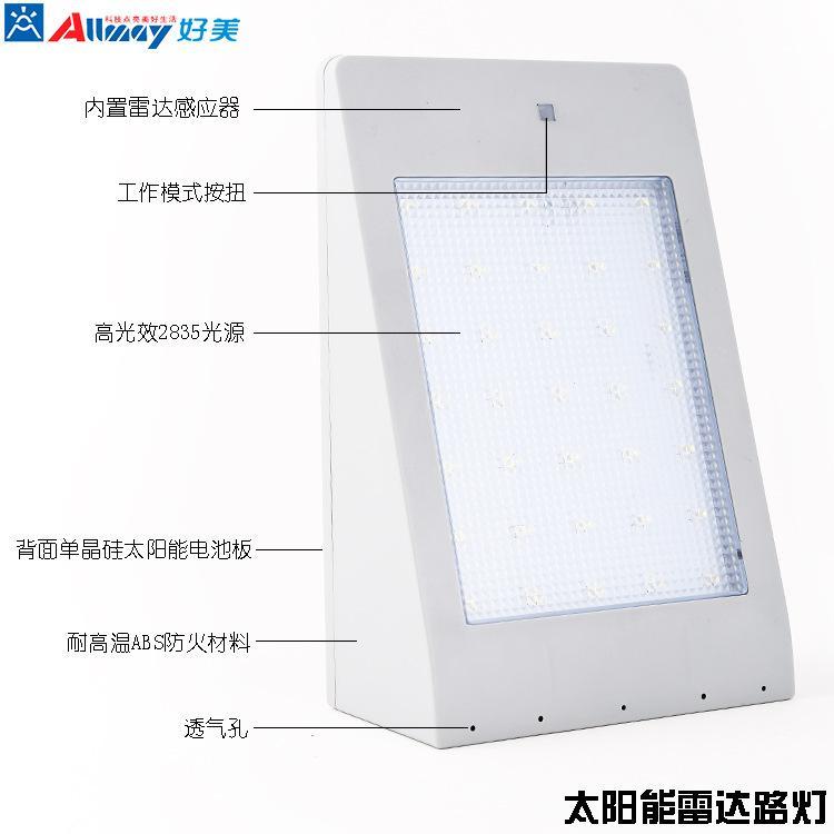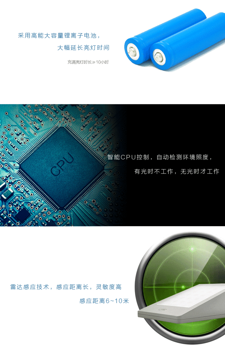 本产品为新型环保、绿色节能LED灯,将太阳能技术、LED照明技术和智能雷达感应技术结合。本灯具采用高效太阳能板对大容量锂离子电池进行充电,并利用微电脑技术和雷达感应技术对移动物体进行识别控制,有人移动时才进行工作,避免无效照明,延长照明时间,本灯具适合户外照明用途,特别适用农村门口、庭院照明和农村村路照明
