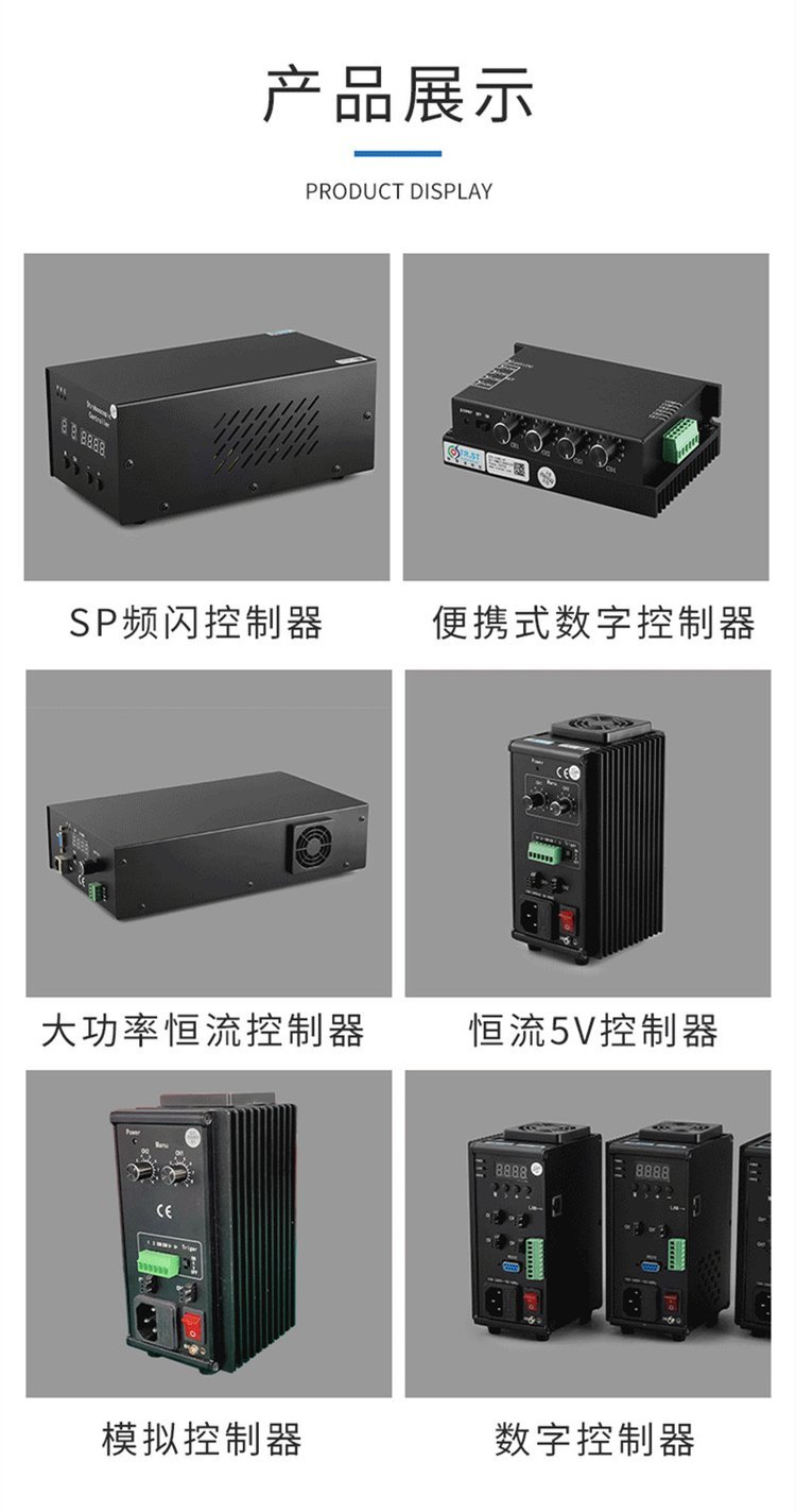 光源控制器是机器视觉光源控制器主要目的是给光源供电,控制光源的亮度并控制光源照明状态(亮灭),还可以通过给控制器触发信号来实现光源的频闪,进而大大延长光源的寿命。市面上常用的控制器有模拟控制器和数字控制器,模拟控制器通过手动调节,数字控制器可以通过电脑或其他设备远程控制。