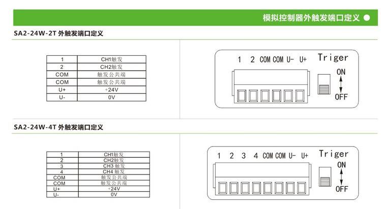 SA2系列模拟控制器,外触发采用高速光耦隔离设计。此外,SA2系列控制器提供24V标准电压输出接口,可为机器视觉检测系统中的其它设备(如相机,PLC)提供供电电源。SA2系列控制器具有大功率、多功能、高响应速度、高稳定性等优点。