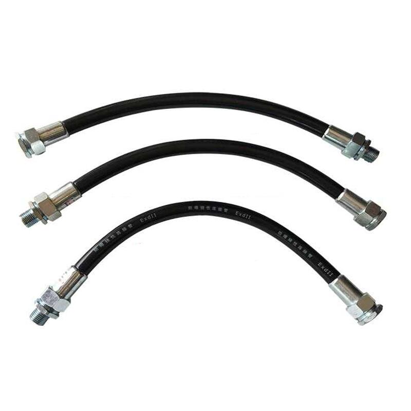 防爆挠性连接管,适用于ⅡBⅡC级T1-T6组爆炸性混合物场所,作为防爆电器设备的进出线连接或钢管布线弯曲难度较大的场所连接之用。防爆挠性管结构软管两端为金属螺纹活接头,管体部分分为金属软管,外层夹布优质橡胶和增强尼布软管护套以及夹层钢丝编织网管三种形式组成。本产品具有耐燃、耐油、耐腐蚀、耐水、耐磨、耐老化、挠性良好、结构牢固、工作可靠等优点。一般有500,700,1000等长度。