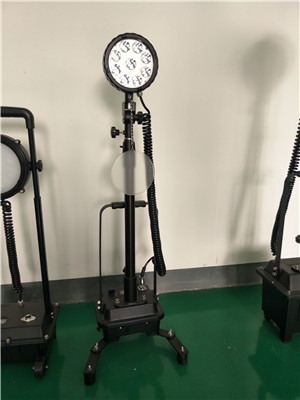 防爆强光工作灯灯头可固定在灯体或其它支撑物上使用,也可方便卸下手持使用,可多角度任意调节照射方向,还能固定在气垫式升降架上1.2-1.75米高度范围内任意升降,升降杆和电池箱为一体式结构,使用方便灵活,灯体底部装有方便的轮子,可在平地上灯置;