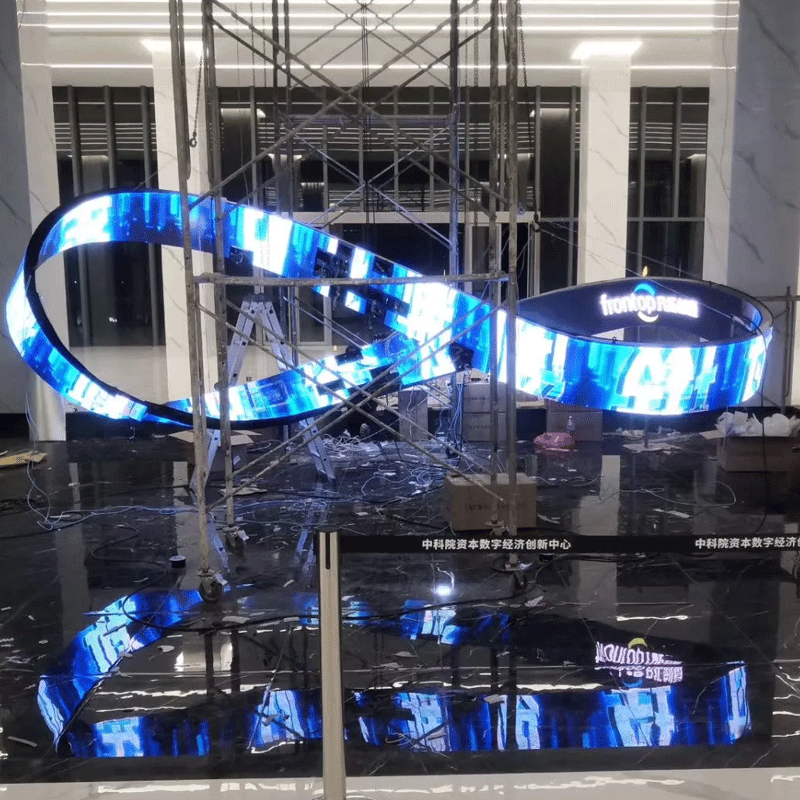 LED莫比乌斯环由多个弯曲的LED模块组成,形成一个闭环或半闭环的结构。LED模块在设计上具有特殊的形状和连接方式,使得它们可以沿着环形路径进行连接,形成连续的显示屏表面。通过控制系统对LED模块进行统一的控制,可以实现显示内容在莫比乌斯环上的平滑过渡和连续显示。
