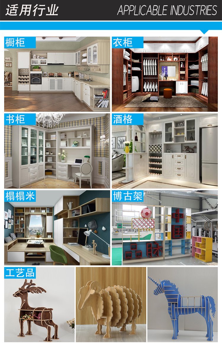 板式家具数控开料机搭配生产线:数控开料机 直线封边机 异型封边机 红外线侧孔机 铰链机。这种生产线的自动化程度高,完全依靠科技实力实现定制家具的生产,而且能够实现各种板式家具制造的定制量化生产,不仅为装修行业进入定制家具制造提供了良好的优势,而且相对传动定制家具厂更加具有得天独厚条件,对于开拓市场具有很好的条件,数控开料机搭配的生产自动化程度高,对人工的依赖性低,成本低,制造工期短,个性化强。成为了目前定制家具厂家必备的制作设备。