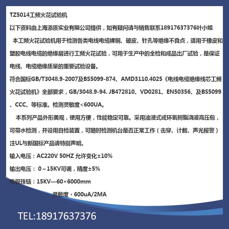 符合国标gb/t3048。9-2007及bs5099-874、amd3110。4025《电线电缆绝缘线芯工频火花试验机》全部要求,gb/3048。9-94。jb472810、vd0281、en50356、及bs5099、ccc、等标准。检测灵敏度 <600ua。