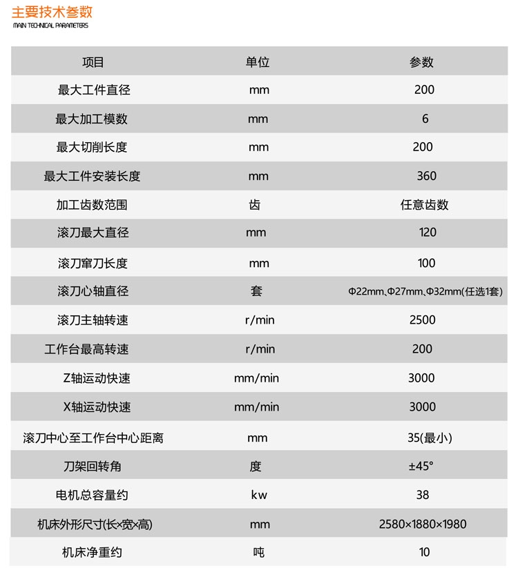 该型号的数控滚齿机,采用广州数控218MC系统,各数控轴均为独立驱动,以电子链按展成原理完成圆柱直齿轮、斜齿轮、蜗轮、花键等齿轮及齿轴的加工。