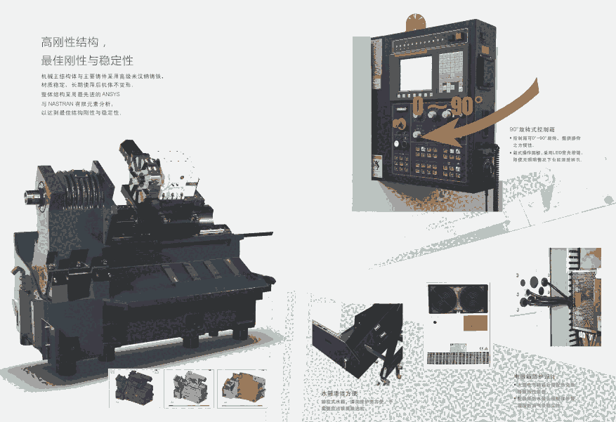 30°斜床式箱型结构设计,确保机器运转时之安全性。高速切削精度与排屑之顺畅性。