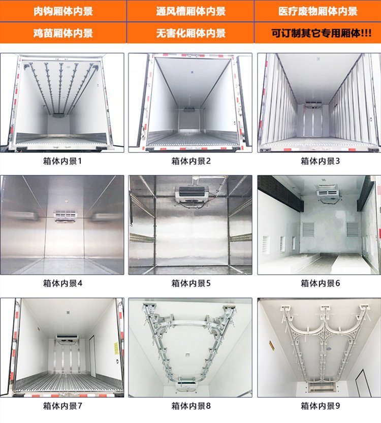 冷藏车可选装:肉钩导轨、通风槽、外接电源、GPRS定位温湿度记录仪、倒车影像、降温器水箱、液压尾板、内部不锈钢材质等等