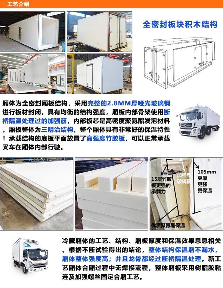上装配置:厢体内外采用玻璃钢材质,中间8cm聚氨酯发泡保温层,厢体底板材质采用花纹防滑铝地板,配不锈钢门锁、不锈钢门框、不锈钢合页、不锈钢上包角,厢体铝型材包边,前站排水孔,厢内顶部安装LED高亮度照明灯,厢体标配3M塑料板反光标牌,可选装各品牌-5°~-18°制冷机组。