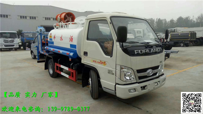 ? ? ? 福田时代5吨洒水车:福田时代底盘,轴距3360mm,安徽全柴490EGR发动机,7.00-16尼龙胎,带暖风,气刹(或油刹),不上牌洒水车价格最低。▲垂直吸程>7米,洒水宽度>14米,射程>28米。前冲(喷)):(能将路面泥巴、尘土、垃圾冲干净);后洒(能均匀地将水洒在路面,洒水宽度>14米)、前侧喷(花洒)(均匀地将路旁绿化带浇灌)、后工作平台,平台上装绿化洒水炮(炮有大雨、中雨、毛毛雨、雾状可调节冲洗高大树木),洒水泵,消防接头,自流阀,过滤装置、人性化爬梯及侧防护栏,音乐喇叭。