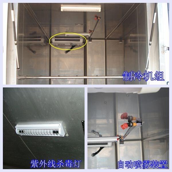 2.厢体内配有制冷机组、紫外线灭菌灯、消毒喷头、垃圾箱定位锁及拉带,设有防液体处理箱。紫外线灭菌灯正常工作时,辐身出大量的253.7nm紫外线,对微生物具有极强的杀伤力,在30~45分钟内完成消毒灭菌工作。