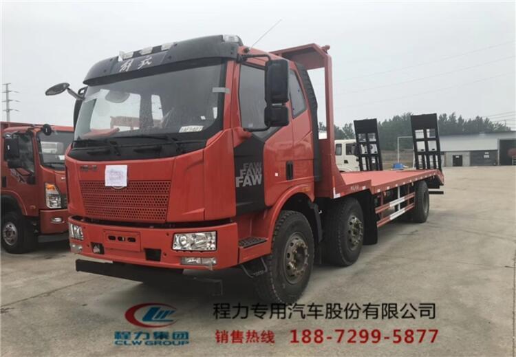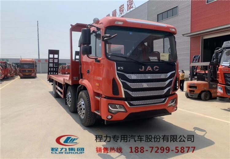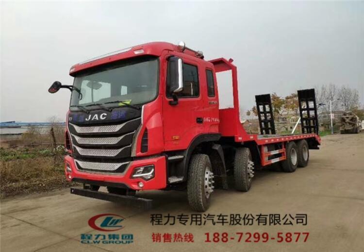 国五排放江淮前四后八挖机平板拖车上装配置:上装可以选择标准型或者重载型。标准型上装横梁采用12*12规格6mm厚方钢,整根贯穿式设计,保证承载性能,货箱平板8mm厚花纹板;重载型上装横梁采用14*14规格8mm厚方钢,整根贯穿式设计,承载性能更好,货箱平板10mm厚花纹板,爬梯采用重载加强型设计,采用三道筋双簧加固处理,带有后支腿,平板带有斜支撑,货箱平板可以伸缩,伸出3米,缩回2.5米,货箱平板长度8米,是运输30-40吨大型挖掘机、大型工程机械等的拖车。