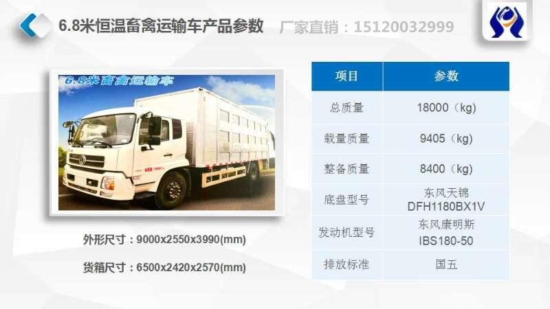 源牧恒温拉猪车有两种型号:东风天龙9.6米(450马力、465马力),东风天锦6.8米(180马力)。全车豪华标准配置