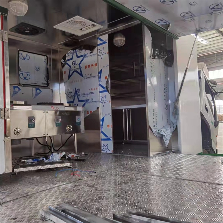 流动餐车上装厢体采用三明治式结构(外玻璃钢内不锈钢,方钢框架内填充保温防火材料),