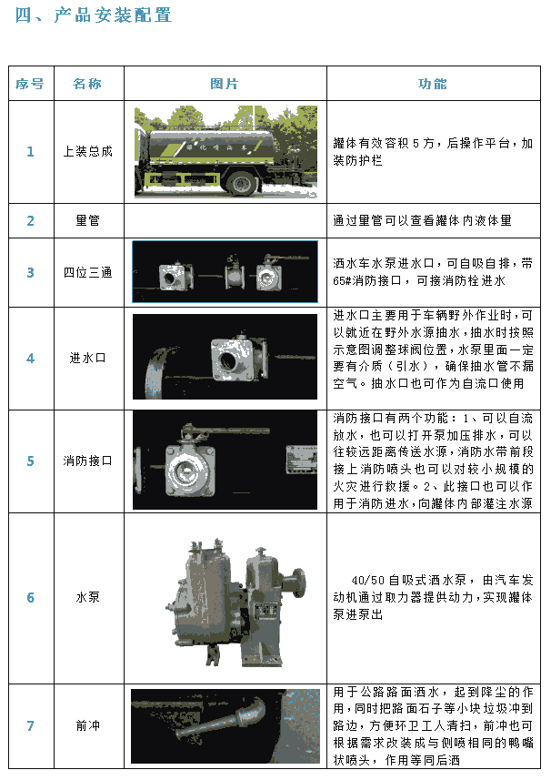 改装配置:罐体用4MM碳钢板制作,罐内隔板具有防波作用,以减低汽车行驶时罐体液体的冲击。整车带一个专用洒水泵(垂直最大吸程6米),