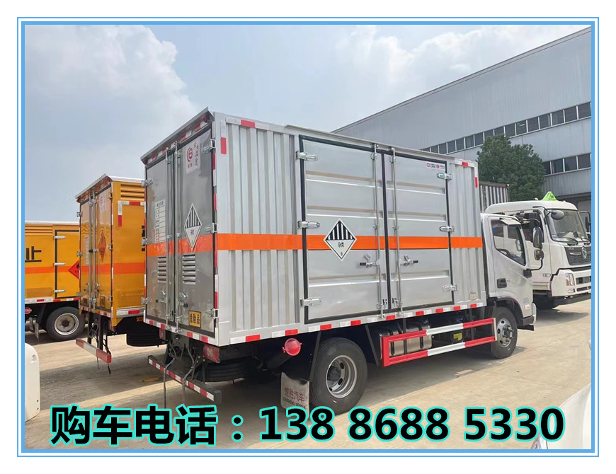 该车适用于运输危险品。厢体顶部封闭,不可开启。仅采用底盘子午线轮胎和带ABS的底盘,该车前轮安装盘式制动器,前置排气管,装配限速装置,限速80km/h。安装带有卫星定位功能的行驶记录仪。安全装置为导静电带,用于防止静电。该车主要用于运输具有独立(瓶)包装的介质,类项号:9。侧防护和后防护装置材料材质为Q235A碳钢,侧防护与箱体底部焊接连接,后防护装置与车架采用焊接连接。后防护截面尺寸(mm):120×50,离地高度为350mm,采用发动机F2.8NS6B131,F2.8NS6B156,Q28-130E60,Q28-130C60,F3.8NS6B156,D25TCIF1,Q23-132E60对应的油耗值分别为(L/100km):10.85,11.07,11.02,11.38,11.27,11.16,11.40。ABS系统型号:ABS-VI.E;生产企业:广州瑞立科密汽车电子股份有限公司。ABS系统型号:ABS-E;生产企业:威伯科汽车控制系统(中国)有限公司。整备质量对应的配件配备:润滑济,燃油箱(90%容量)等。选装侧开门结构。随底盘选装驾驶室。