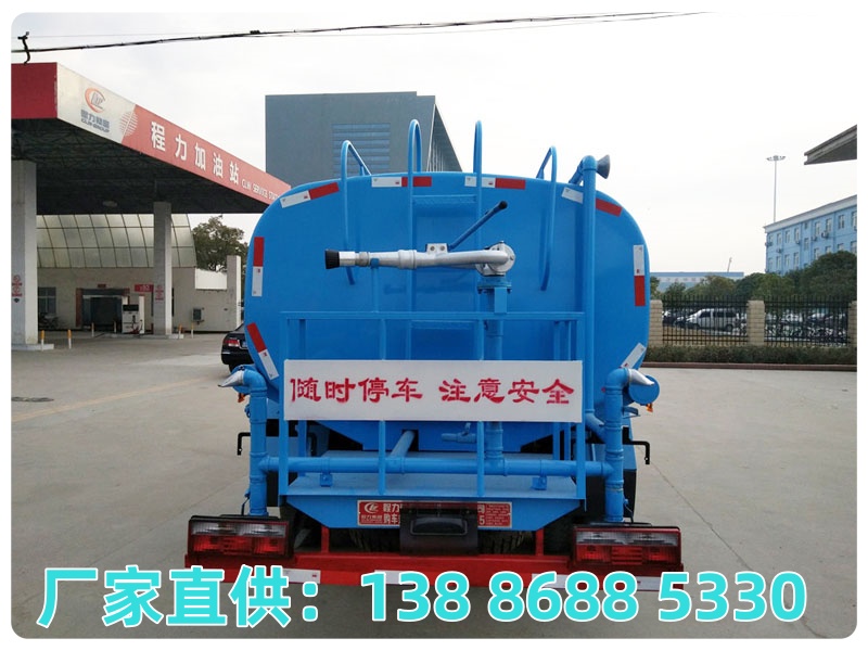 该车专用装置由罐体、喷洒系统组成,主要用于洒水及园林绿化; 仅采用4500mm轴距; 罐体总容量:11.27立方米,有效容积:10.74立方米,介质:丙酮水溶液,密度:950千克/立方米,罐体尺寸(长×宽×高)(mm):5000×2400×1600; 当不装电子水炮时,整车外形长/前伸/前悬/后悬对应关系为(mm):8850/0/1450/2900,8820/0/1420/2900,8660/0/1260/2900; 装电子水炮时,整车外形长/前伸/前悬/后悬对应关系为(mm):9350/500/1450/2900,9320/500/1420/2900,9160/500/1260/2900; 侧面防护及后部防护材料均为Q235,连接方式均为螺栓连接,后防护截面尺寸:150×50mm,下边缘离地高480mm; ABS型号/系统生产厂家: J ABS/焦作博瑞克控制技术有限公司;ABS/ASR-24V-4S/4M/襄阳东风隆诚机械有限责任公司; 后悬架仅采用钢板弹簧; 随底盘选装驾驶室,选装限速装置,限速89km/h; 选装不带电子水炮外观,选装罐体上罐口位置管道箱外观,选装后平台样式,选装后喷雾装置,选装方形挡泥板,选装电子炮样式,选装气动装置,选装前喷洒样式,选装后喷洒样式,选装踏梯样式,选装箭头灯,箭头灯仅在作业状态下开启,选装中置喷洒装置,选装注水阀外观样式,选装洒水炮样式; 随底盘选装附件储气筒尿素罐安装位置.