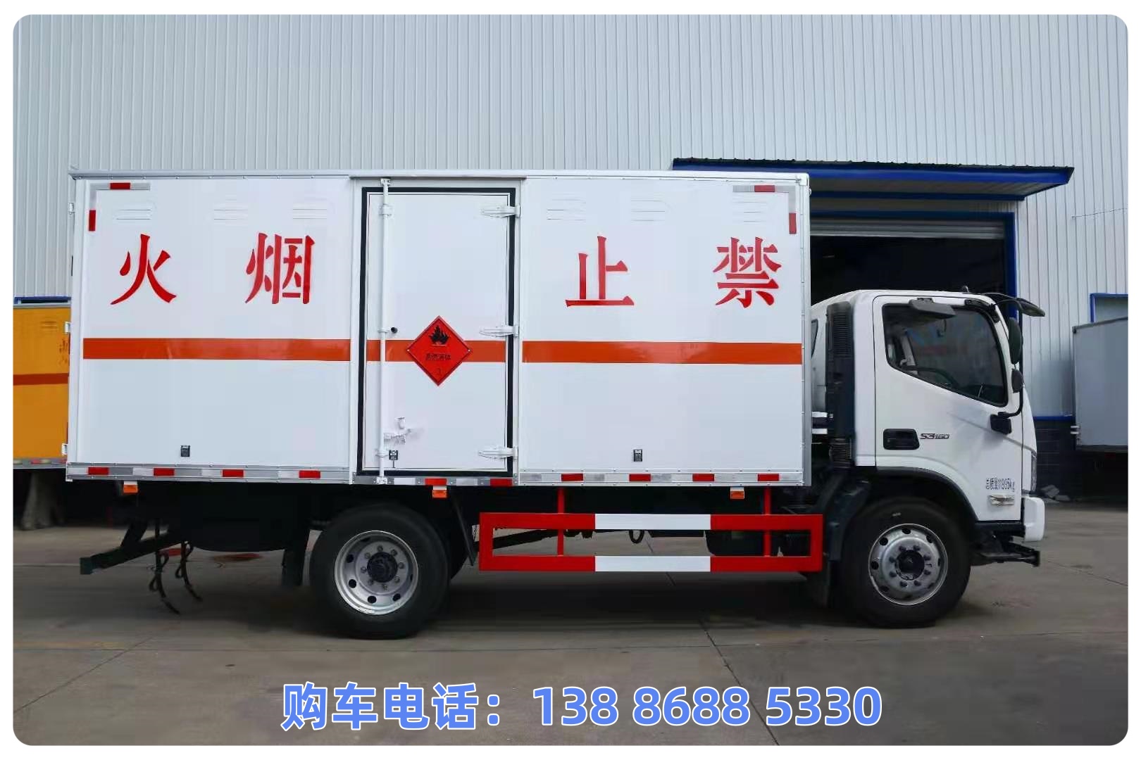 该车适用于运输危险品为危险货物运输车,厢体顶部封闭,不可开启; 该车运输具有独立容器包装的介质。运送危险品类项号为2.1,2.2;该车运输的介质为2.1项易燃气体时,车辆采用”易燃气体”标识牌,运输的介质为2.2项非易燃无毒气体时,车辆采用”不燃气体”标识牌;该车仅使用排气管前置,前轮为盘式制动器底盘,转向轮安装轮胎爆胎应急防护装置,仅使用子午线轮胎;ABS系统控制器型号/生产企业:ABS-E/威伯科汽车控制系统(中国)有限公司,ABS-VI·E/广州瑞立科密汽车电子股份有限公司;该车安装具有卫星定位功能的行驶记录仪,该车装配有限速装置,限速80km/h;侧、后防护材料:Q235A,连接方式:焊接连接;后防护断面尺寸:100mm×50mm,后防护离地高度:460mm;发动机型号/油耗值对应关系为(L/100km):F2.8NS6B131/11.47, Q28-130E60/11.47,F2.5NS6B131/11.27.D25TCIF1/11.16.随底盘选装驾驶室及选装右侧箱体侧门型式及位置。转向轮装备轮胎爆胎应急防护装置。该车可选装ETC车载装置。整备质量对应的配件配备:润滑济,燃油箱(90%容量)等。车厢质量约为860kg。厢体材质:内板为铝板(厚度1mm),外板为碳钢Q235(厚度1.2mm),夹层聚氨酯阻燃泡沫(厚度40mm),货厢底板为槽钢骨架厚度为100mm。随底盘选装右侧塑料油箱.选装铝合金轮辋.选装隔热板.选装储气筒位置.