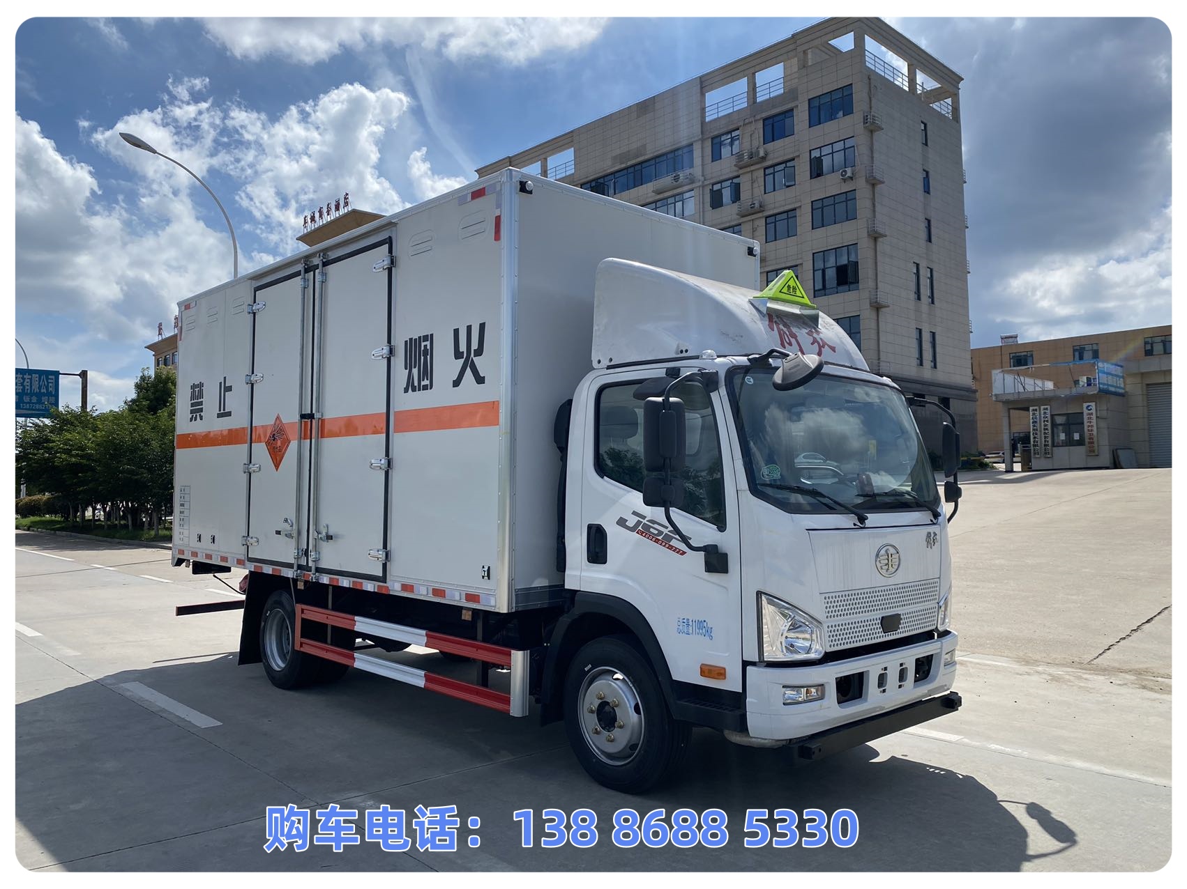 车厢顶部封闭且不可开启;运输独立容器(瓶)包装的货物;危险货物车辆类型:EX/Ⅲ型车辆;危险货物类项号:1.1B,1.1G,1.3C,1.1D,1.2D,1.3C,1.1C,1.4G;该车为危险品运输车。ABS生产厂家/型号:1.广州瑞立科密汽车电子股份有限公司/CM4XL-4S/4M;2.浙江万安科技股份有限公司/VIE ABS-II。安装有限速装置;限速装置限速(km/h):80;安装带有卫星定位功能的行驶记录仪。发动机/油耗值(L/100km)对应关系为:WP3NQ160E61(20.85),D30TCIF1(21.03),CA4DD1-16E6(21.18),CA4DD2-18E6(21.25)。连接方式:左右侧面防护采用焊接加螺栓连接,后下部防护采用螺栓连接,防护材料:Q235碳钢,后下防护断面尺寸(直径):Φ120(mm),离地高度:450mm。仅采用底盘子午线轮胎,该车前轮安装盘式制动器,前置排气管,转向轮安装轮胎爆胎应急防护装置。该车型选装采用直接供电方式的ETC车载装置。随底盘选装驾驶室,选装电瓶,尿素罐,储气筒左右安装位置。安装液压尾板:收起状态的水平长度是280mm,尾板质量为450kg。选装空调样式。选装不带侧开门;选装不带尾板时后下部防护:螺栓连接,材料:Q235A碳钢,断面尺寸(mm):120×50,离地高度:450mm。整车长/轴距/前悬/后悬(mm)对应关系为:7390/3900/1155/2335,7100/3900/1155/2045,6875/3900/1155/1820。选装抗爆容器时,车厢需加隔断,抗爆容器安装在隔舱内;厢体侧面选装开门型式和位置。选装侧面开门和后尾板照片。
