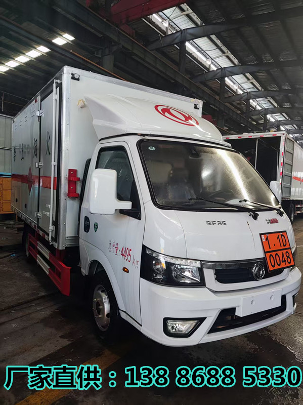 该车为危险品运输车,车厢顶部封闭且不可开启;运输独立容器(瓶)包装的货物;危险货物车辆类型:EX/Ⅲ型车辆;危险货物类项号:1.1B,1.1G,1.3C,1.1D,1.2D,1.3C,1.1C,1.4G;ABS厂家及型号:襄阳东风隆诚机械有限责任公司/ABS/ASR-12V-4S/4M;安装有限速装置;限速装置限速(km/h):80;安装有具有卫星定位功能的行驶记录仪;所用材料材质、连接方式以及后部防护装置的主要尺寸参数(断面尺寸和离地高度):侧、后防护材料:Q235B碳钢,连接方式:左右侧面防护采用焊接加螺栓连接,后下部防护采用焊接连接,后下部防护断面尺寸(mm):100×50,后下部防护离地高度(mm):350;仅采用底盘子午线轮胎,该车前轮安装盘式制动器,前置排气管,转向轮安装轮胎爆胎应急防护装置。安全装置为导静电带,用于防止静电。选装右侧厢体不开侧门时的宽度为1950mm或1860mm或1750mm。整车长/轴距/前悬/后悬/接近角/离去角对应关系为(mm):5995/3200/1190/1605/21°/12°,5900/3200/1190/1510/21°/13°,5700/3200/1190/1310/21°/15°,5700/2800/1190/1710/21°/12°,5600/2800/1190/1610/21°/12°,5500/2800/1190/1510/21°/13°,5400/2800/1190/1410/21°/14°,5200/2600/1190/1410/21°/14°,4900/2600/1190/1110/21°/17°,4700/2600/1190/910/21°/21°。整备质量对应的配件配备:含备胎、灭火器、清洗液、冷却液,燃油箱加满。轴距(mm)3200,2800,2600分别对应货箱重量(kg)970,860,720。选装采用直接供电方式的ETC车载装置。发动机Q23-95E60对应油耗值(L/100km)为11.2;随底盘选装驾驶室。厢体材质:内板为铝板(厚度1mm),外板为碳钢Q235(厚度1.2mm),夹层聚氨酯阻燃泡沫(厚度40mm),货厢底板为槽钢骨架厚度为100mm。选装带尾板时后下部防护材料:Q235B碳钢,连接方式:采用焊接连接,后下防护断面尺寸(直径):Φ110(mm),离地高度:400mm;尾板:收起状态的水平长度是280mm,尾板质量为350kg。厢体侧面选装开门型式及位置,选装瓦楞板结构,厢体前后及侧面选装开百叶窗。