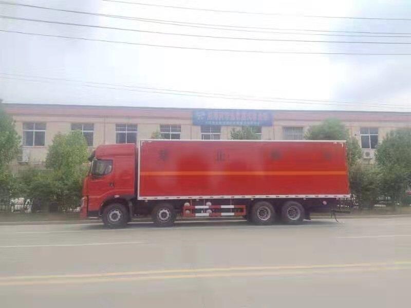 厢体配置:严格按照公告尺寸制作,外板采用1mm厚冷轧板有一次性成型的百叶窗,内饰为导电性能良好的铝板有透气孔,内衬为矩形管骨架牢靠稳定,内部填充为透气防潮阻燃的挤塑板,四种材料经现代工艺复合而成,厢体外部上下铝合金型材包边,底板和车厢前下部铺橡胶皮,后门双开,右侧两个双开门,内部有固定货物的卧环,车辆外部有静电带、灭火器、防火罩,车厢内安装烟雾报警器和门防盗报警器,严格按照国家危险品相关法规张贴