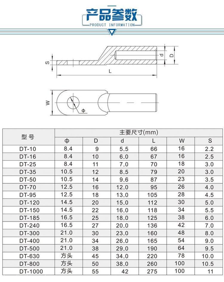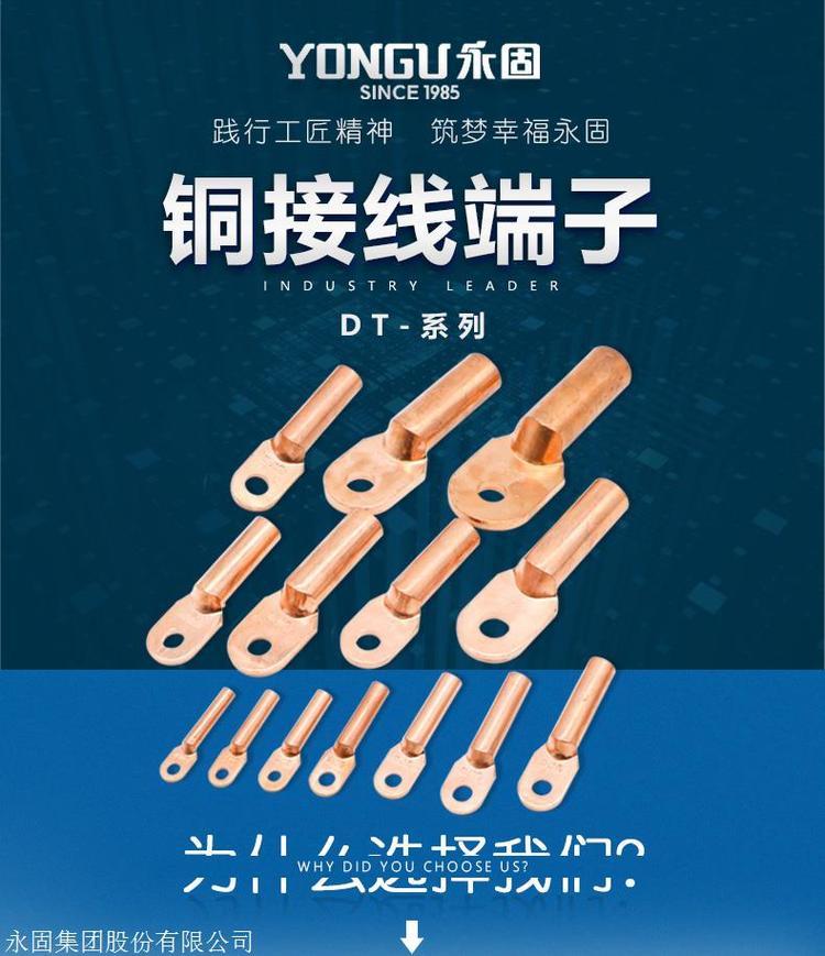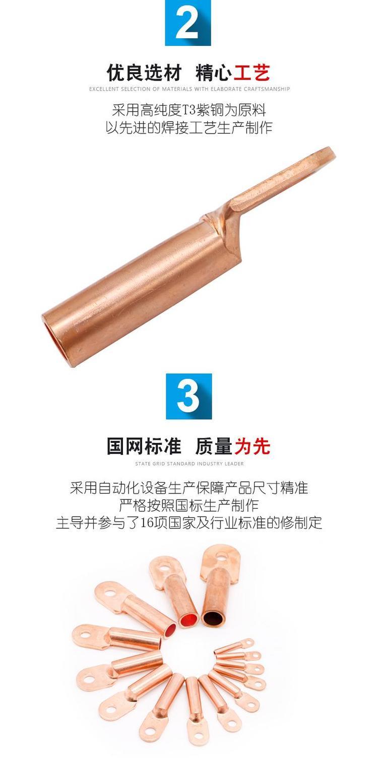 型号1:DT,是由T3铜棒做成, 产品外貌为锅铲圆头,可用于密封堵油,顶端这边为固定上螺丝用,末端插进剥皮后的电缆用端子钳压紧即可。