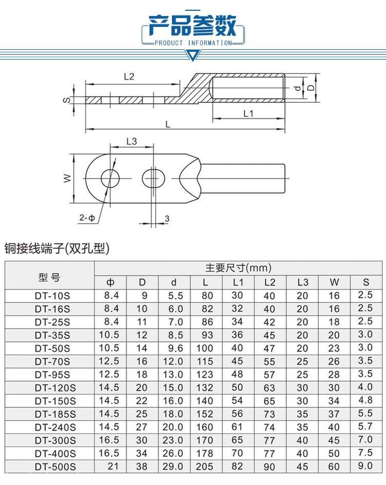 型号1:DT,是由T3铜棒做成, 产品外貌为锅铲圆头,可用于密封堵油,顶端这边为固定上螺丝用,末端插进剥皮后的电缆用端子钳压紧即可。