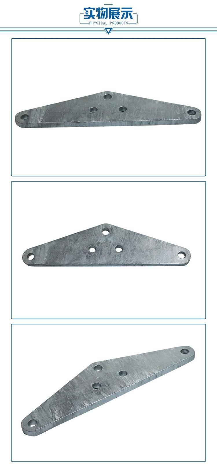是联板的形式有:L型单串绝缘子与二分裂导线联板或双串绝缘子与单根导线联板及三联板;LF型双串绝缘子与二分裂导线联板;LV型双拉线并联联板;LS型组合母线用双联板;U型 装均压环用联板。联板型号中字母及数字的含义为:L,联板;F,方形;V,V形;S,双联;J,装均压环;数 字,前两位表示破坏负荷(X104N),后两位表示孔距(cm)。它适用于架空电力线路和变电站组装多 串悬式绝缘子串,分裂导线与绝缘子串的固定及多根拉线并联。