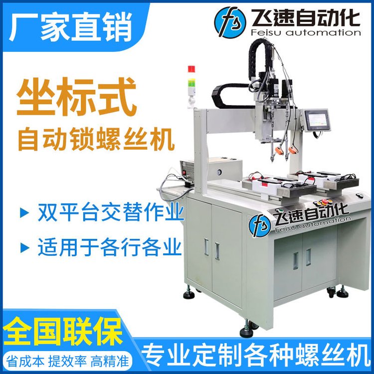 这种模式的自动送锁螺丝机最大的优点就是灵活,效率高。根据设定好的坐标,机器自动完成产品锁付。Z轴最多可装4把电批同时锁付,极大提高生产效率。更换产品,只要通过修改锁付点坐标即可。操作非常简单。在如今产品更新换代较快的时代可以极大的节省固定资产的投资。上料系统采用涡轮直振方式上料将螺丝排序到振动导轨上,并输送到螺丝分配系统,通过分配系统分配螺丝并通过气管压力将螺丝送到锁嘴,通过机械手根据设定好的坐标自动完成锁付。
