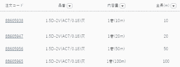 用途音声信号の伝達、無線の送受信、信号回路や機器間及び機器内部の接続に使用。 ケーブル1.5D-2V 耐電圧1000V/分 材質(シース)PVC(塩化ビニル) 材質(絶縁体)PE(ポリエチレン) 静電容量104Nf/km 概算質量(kg/km)18 導体抵抗(Ω/km)(20℃)110 絶縁抵抗(MΩ/km)1000 シース色灰 導体構成(本/mm)7/0.18 導体外径(Φmm)外部1/2.2、外部2/- 絶縁体外径(mm)1.6 シース外径(Φmm)3 標準減衰量(dB/km)85(10MHz時) 特性インピーダンス(Ω)50