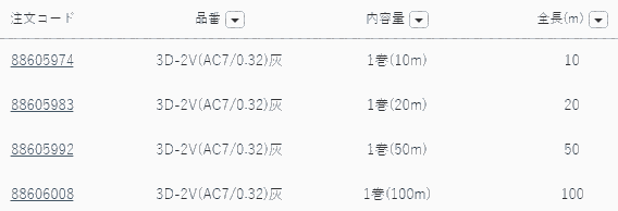 用途音声信号の伝達、無線の送受信、信号回路や機器間及び機器内部の接続に使用。 ケーブル3D-2V 耐電圧1000V/分 材質(シース)PVC(塩化ビニル) 材質(絶縁体)PE(ポリエチレン) 静電容量100Nf/km 概算質量(kg/km)44 導体抵抗(Ω/km)(20℃)33.3 絶縁抵抗(MΩ/km)1000 シース色灰 導体構成(本/mm)7/0.32 導体外径(Φmm)外部1/3.7、外部2/- 絶縁体外径(mm)3 シース外径(Φmm)5.3 標準減衰量(dB/km)309(400MHz時)、471(900MHz時) 特性インピーダンス(Ω)50