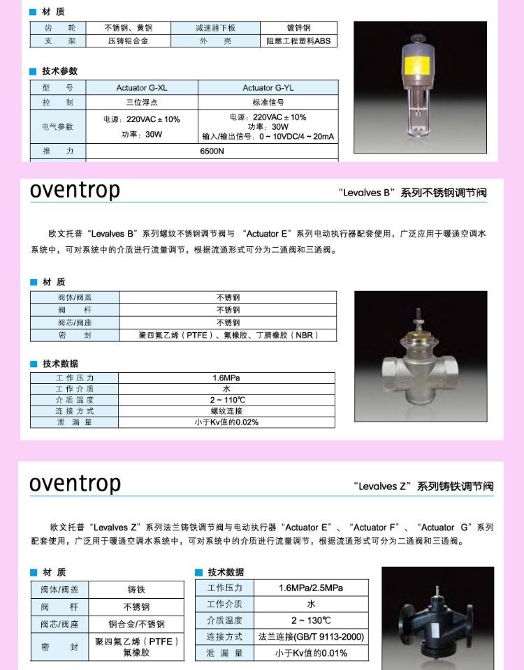 oventrop"Levalves Z"系列铸铁调节阀欧文托普"Levalves Z"系列法兰铸铁调节阀与电动执行器"Actuator E"、"Actuator F"、"Actuator G"系列配套使用,广泛用于暖通空调水系统中,可对系统中的介质进行流量调节,根据流通形式可分为二通阀和三通阀。 材 质 技术数据