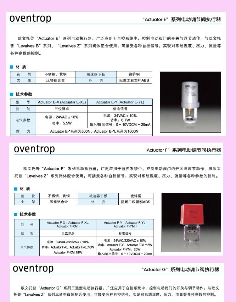 oventrop"Actuator F" 系列电动调节阀执行器欧文托普"Actuator F"系列电动执行器,广泛应用于自控系统中,控制电动阀门的开关与调节动作;与欧文托普"LevalvesZ" 系列阀体配合使用,可接受各种自控信号,实现对系统温度、压力、流量等各种参数的控制。 材 质