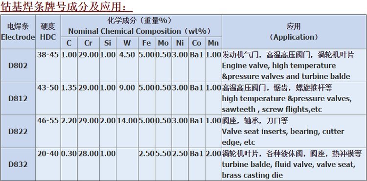 说明:高碳钴铬钨合金焊芯的钴基堆焊焊条,采用直流反接,渣覆盖性好,成形美观,具有优良的耐磨、耐热、耐腐蚀性,在650高温也能保持这些特性。
