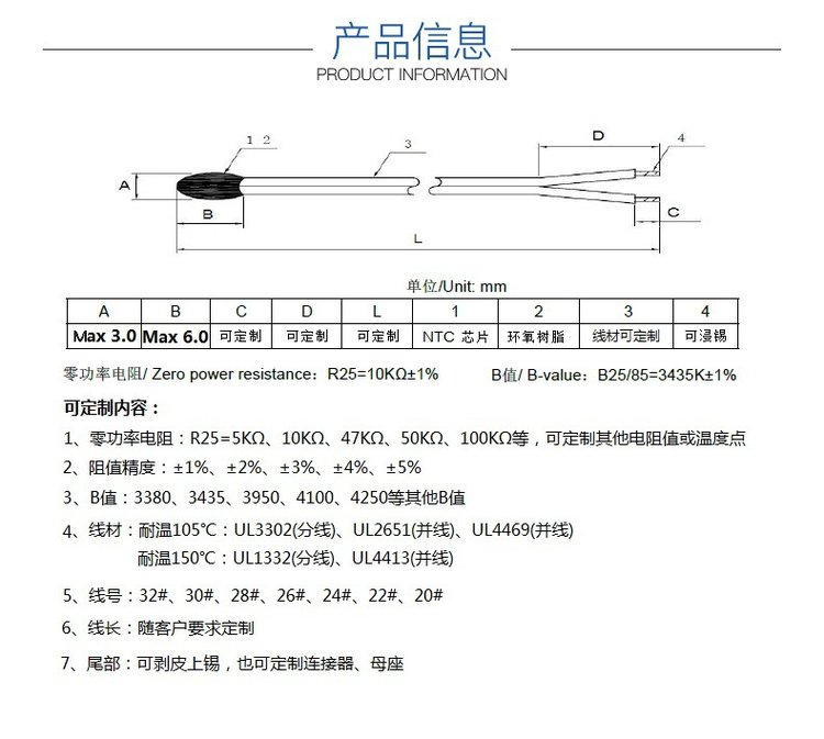 高精度环氧树脂小黑头热敏电阻带引线10K343510K3950100K3950