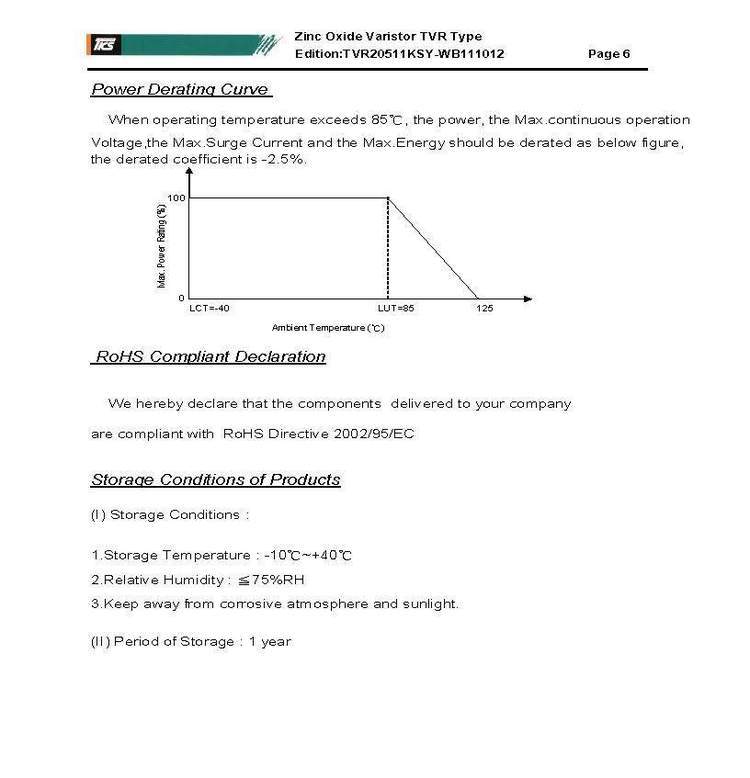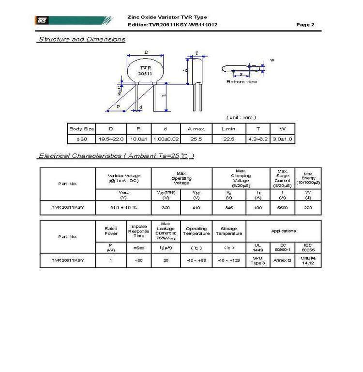 特性 1. 符合RoHS 2. 可提供无卤要求的系列产品 3. 本体尺寸:Ф5mm ~ Ф20mm 4. 宽工作电压范围:11Vac ~ 1000Vac 5. 工作温度范围:-40°C ~ 85°C 储存温度范围:-40°C ~ 125°C 6. 安规认证:UL 1449 3rd / UL 1414 /cUL / VDE / CSA / CQC 7. TVR14181~14112和TVR20181~20112符合IEC 60950-1 Annex Q要求 8. TVR20系列可选择适用于UL 1449 3rd SPD Type 2应用 1 78 1 77 用途 1. 电源供应器 2. 家用电器 3. 工业设备 4. 通信设备 5. 智能控制型电表 6. 电力线智能通讯设备 7. 照明 8. 光伏系统 |