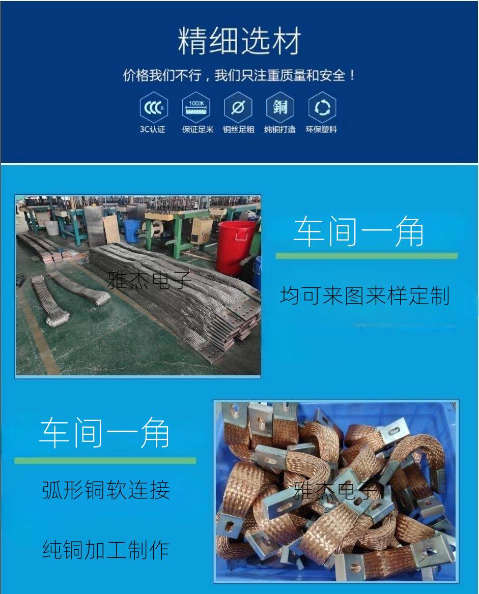 工艺: 镀锡铜编织线先压平,再叠加。两端经特殊工艺冷压加工。