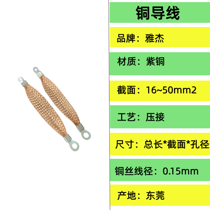 铜导线可选用常规尺寸,也可根据客户要求定制,截面一般为16平方毫米至50平方毫米,常用为25mm2,端头默认线耳款6mm孔径。