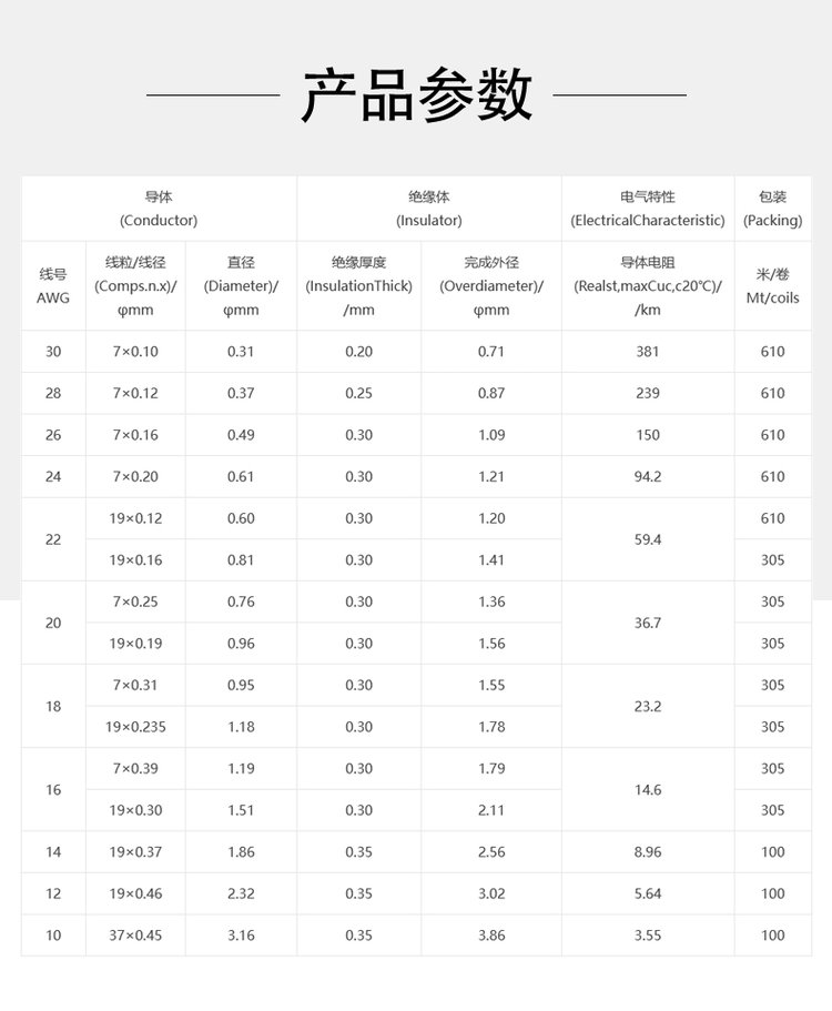 导体线号30AWG~10AWG
