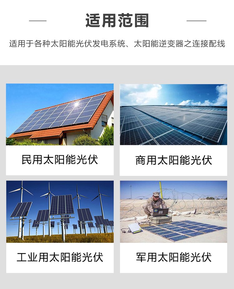 适用范围 | 适用于各种太阳能光伏发电系统、太阳能逆变器之连接配线 | ||