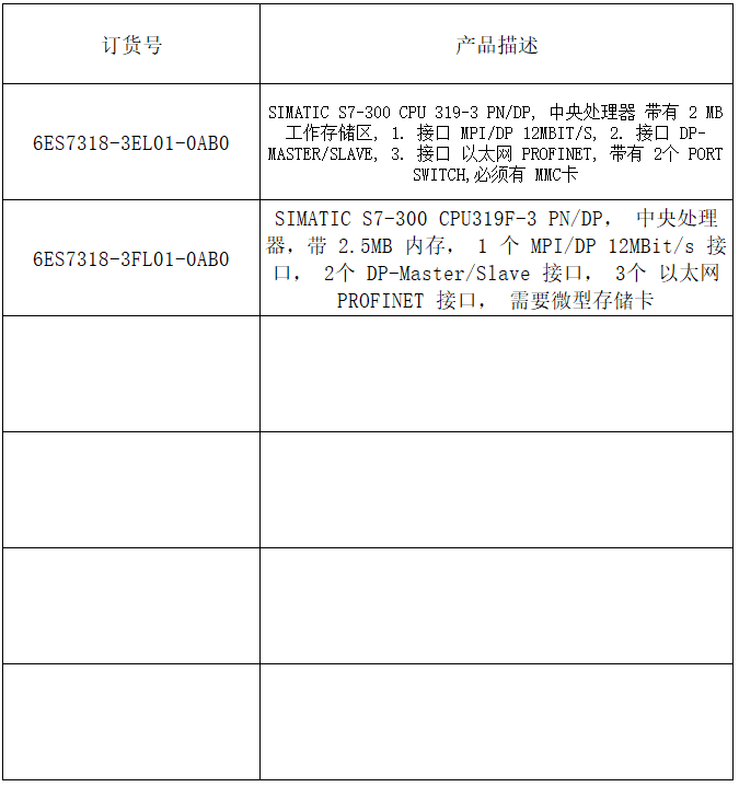 6ES7318-3EL01-0AB0西门子SIMATICS7-300 319-3 PN/DP中央处理器 用途 | 319-3 PN/DP中央处理器 | ||