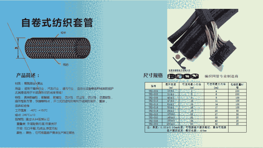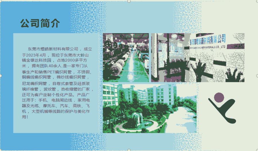 东莞市煜皓新材料有限公司,创立于2007年,原公司名(东莞市煜辉电子有限公司)。现位于东莞市大岭山镇金雄达科技园,占地4000多平方米,拥有团队40余人。是一家专门从事生产和销售PET编织网管,不锈钢、铜编线编织网管,棉纱线编织网管,尼龙编织网管,自卷式套管及硅质玻璃纤维管,波纹管,热收缩管的厂家,还可为客户定制个性化产品。产品广泛用于:手机、电脑周边线,家用电器及光缆、摩托车、汽车、高铁、飞机,大型机械等线路的保护与美化作用!