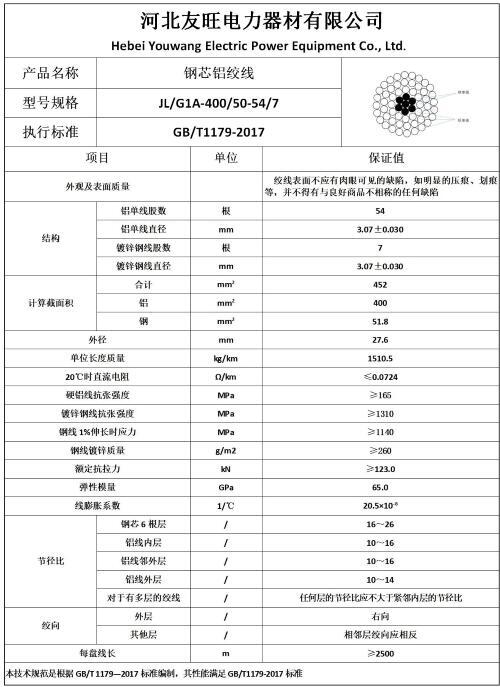 四、JL/G1A山东钢芯铝绞线批发价格400/50厂家产品基本参数及样本图片: